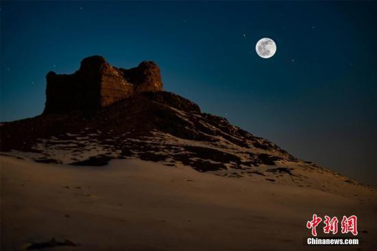 连日来,甘肃敦煌出现降雪天气。位于敦煌城西南70公里的阳关景区也被厚厚的白雪覆盖,夕阳映照,丝路古道更显苍茫辽阔;明月初升,朗照“雪色”大漠。王斌银 摄