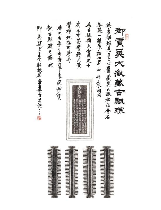 关于吴大澂获得此琮的时间,不出意外的话,应该介于编印《古玉图考》的光绪十五年(1889),结束丁忧入京候选的光绪十八年(1892)之间。而笔者更倾向于光绪十八年,殆光绪十六年(1890)至十八年(1892)三年,吴大澂因母亲去世,丁忧在家,以书画遣兴,尽管有徐翰卿为之搜罗古物,但所得似并不多。其古玉之搜藏,主要来源是京师的古董店。巧合的是,王文心旧藏《吴大澂拓注金石各器屏》朱拓四条屏中,古组琮所在的一条,其上方的“古玉玺”拓本吴大澂在题跋最后用了“愙斋所作时年五十有八”朱文方印,证明这一套朱拓四条屏制作的时间为光绪十八年(1892)年,至少其获得此琮的时间必不可能晚于该年。