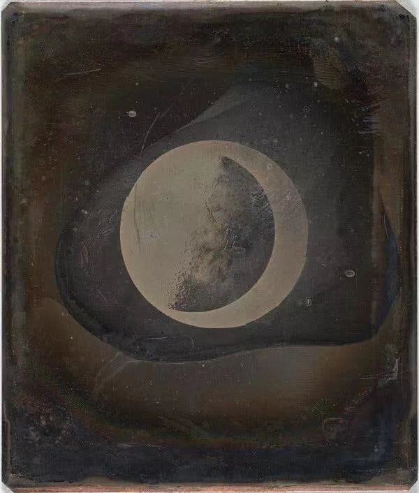 德雷伯1840年拍摄的月球照片,月球周围的光晕由太阳光线投射在月球表面的阴影造成。