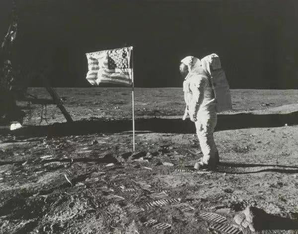 1969年,阿波罗-11号宇航员阿姆斯特朗拍摄的同伴奥尔德林在月球上行走的照片。