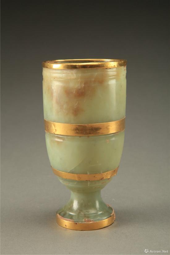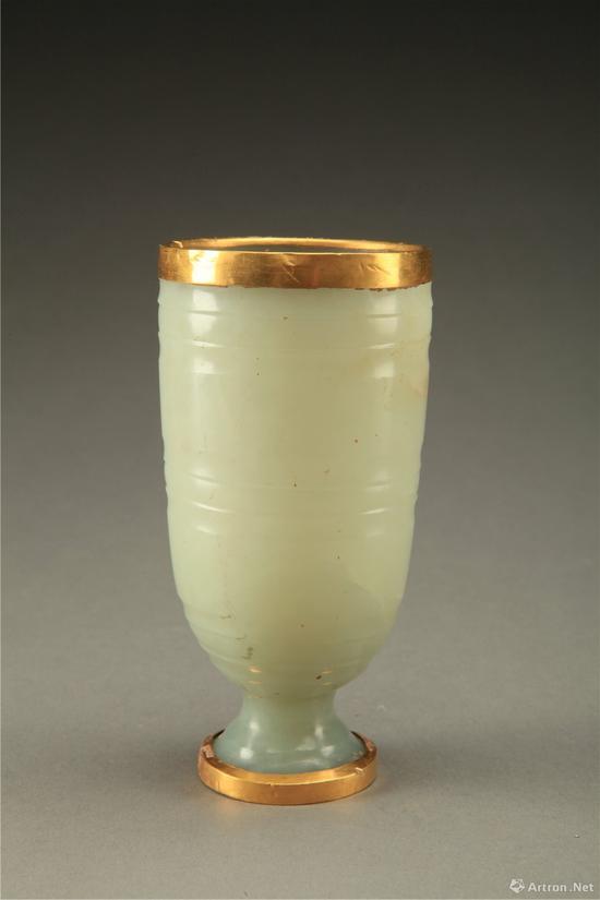 其中两件玉杯上束有厚0.1厘米的扁平状金箍,材质细腻、工艺精湛,玉杯腹部最薄处仅有0.1厘米,杯体外碾琢的凹弦纹均匀流畅,既可使金箍紧贴杯体,又可增加手持时的摩擦力,并具有很强的装饰性。
