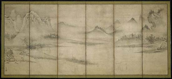 与那个时代的其他水墨画家一样,相阿弥将多以卷轴、册页形式出现的中国山水画作为其屏风和和式拉门的灵感来源,为京都的府邸和寺庙营造沉思的氛围。《四季山水图 (潇湘八景)》借鉴自十三世纪的中国僧侣画家牧溪绘制的《潇湘八景》。