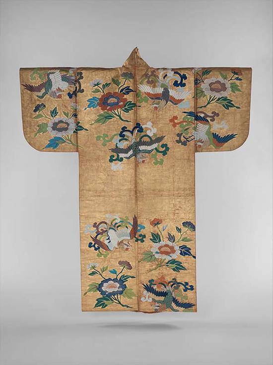 随着日本开始参与全球贸易,京都的高级武士穿着由欧洲面料制成的阵羽织。展览中的一件桃山时期的阵羽织属于与丰臣秀吉或德川家康相关的军阀或高级将士。 这件外套的褶皱由中国锦缎制成,并配以金银色云龙纹。 背心由西方进口的羊毛制成,这在十六世纪晚期的日本是一种奇特材料。