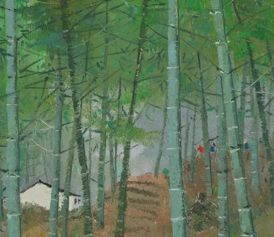 《黄山竹林》宁静清幽的意境中处处可见艺术家的用心营造。画面运用竹林的竖向布局和“微仰”的视角来拉伸整个纵向空间,突显出竹林直冲云霄、挺拔向上的生长态势。竹子的主干造型用灰绿突显,枝桠以细致、短促的横涂和刮痕来营造纤韧遒劲的效果,竹林密叶处,艺术家则用了意象化的处理方式,竹林近处细致勾勒星星点点几枝竹叶,远处的竹林更多运用抽象的笔触、不同明度的绿色来进行层次丰富的递变,呈现出竹叶婆娑、漫林浸透的效果。在绿色和褐色的主色调中点缀着白墙黑瓦、红衣蓝衫,画面右下角散落的几朵蓝花,别增画面意趣。竹林袅娜摇曳,小径曲折幽深,屋舍掩映其间,远处人影隐现,营造出一种清新安谧, 闲静幽远的意境。