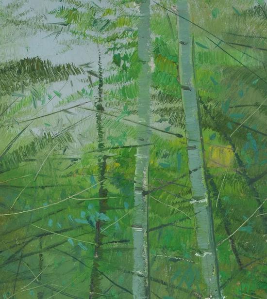 “我用油画来画竹林,竭力想表现那浓郁、蓬松、随风摇曳的竹林风貌,以及那干枝交错、春笋密密的林间世界。”