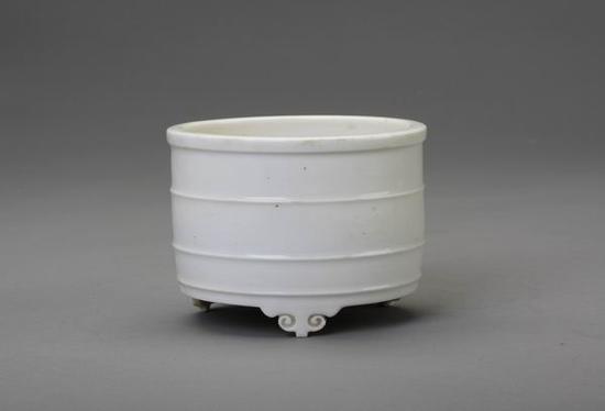 直口,平沿,方唇,筒腹,平底微凸,底沿附三如意头状足。外壁上下分别饰三道凸弦纹。腹中两周弦纹内印对称回地六夔纹。内外壁施乳白釉,釉色莹润光洁,内外底露胎,胎质坚致细白。