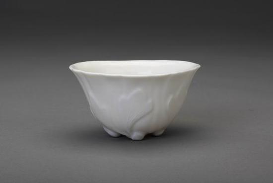 敞口,深腹斜收,四矮足,杯口椭圆形花瓣口,杯外饰花卉纹,枝叶延伸足底。胎质坚硬洁白,釉面光润,叶脉纹络清晰。