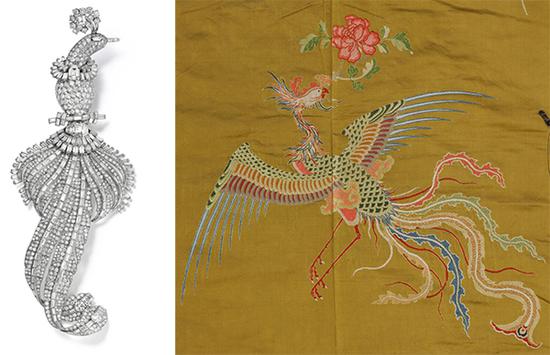 天堂鸟胸针,1948年卡地亚,特别定制;香色翔凤纹妆花绸女棉袍,清乾隆,故宫博物院藏。