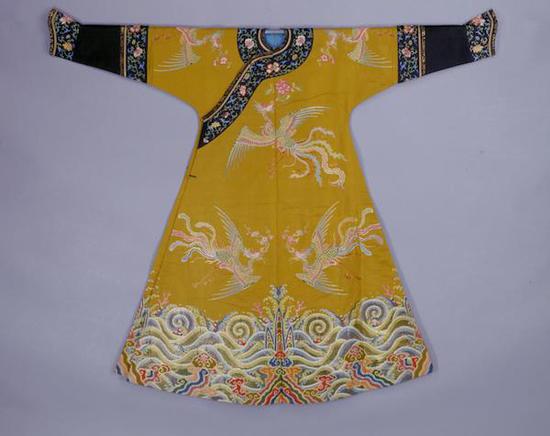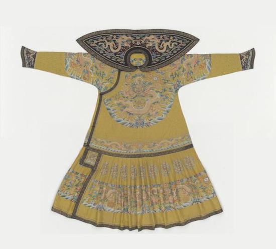 明黄色纳纱彩云金龙纹男单朝袍,清乾隆,故宫博物院藏。