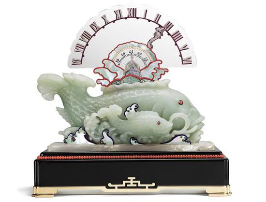 20世纪初,卡地亚第三代掌门人路易·卡地亚的东方艺术品收藏为当时卡地亚的设计师们提供了丰富的灵感。在其带领下,卡地亚对于中国文化和艺术的高度理解和把握,将中国传统艺术完美融入现代审美精神和造型设计。而制造于1925年的逆跳指针鲤鱼时钟更是卡地亚经典代表作。海水江崖式造型灵感源于中国龙袍装饰纹样,寓意“江山永固”,而指针的装饰小龙则契合了中国民间祝愿高升的吉祥语“鲤鱼跃龙门”动态形象,时间与永恒,鲤鱼、海水到龙的升华,卡地亚对异域文化的精准理解和超凡创造力,成就了形式与内容的统一。