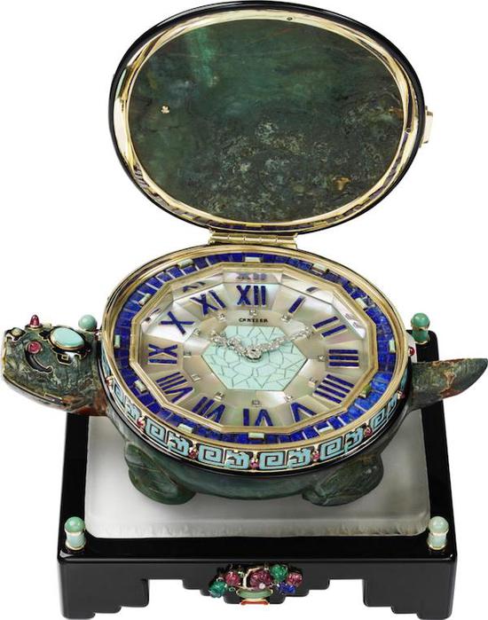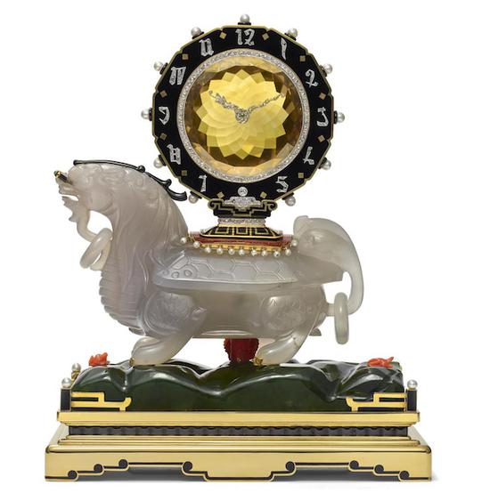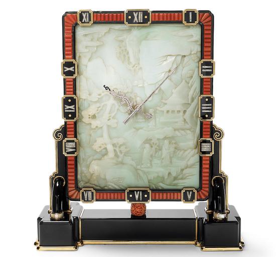 从十八世纪初开始,中国风格大量运用于西方钟表造型工艺中,卡地亚1922年至1931年生产的13款以中国神话瑞兽、神话人物为主题的系列时钟便是其中的经典代表。