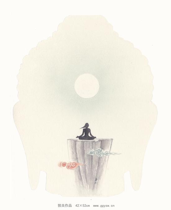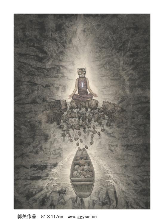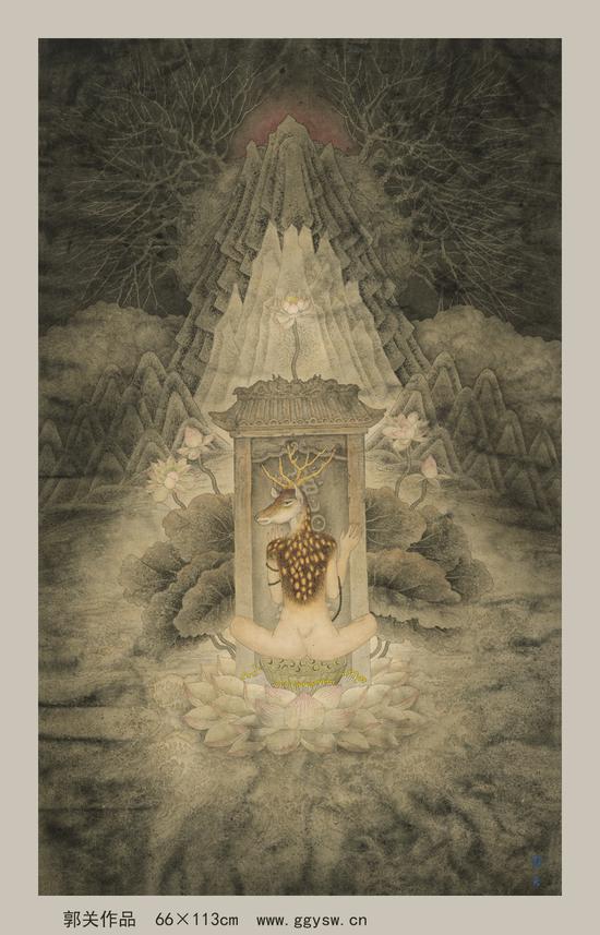 当作画的人同时也是音乐家时,音乐与绘画之间的共通就更强,更容易为人捕捉。郭关的作品以全新的视角,结合中国画、版画、现代装饰设计等学科精华,打破画种、绘画科目的界限,强调画面意境的营造,富于视觉冲击力,奇异玄妙的构思中透露着对宇宙、对生命的敬畏和哲思,并通过线条、墨色、意象等手段形成抑扬起挫的节奏感、音乐感和诗意。观赏时,同时聆听郭关本人演奏的古琴、尺八曲,也让乐曲更加具象可感。
