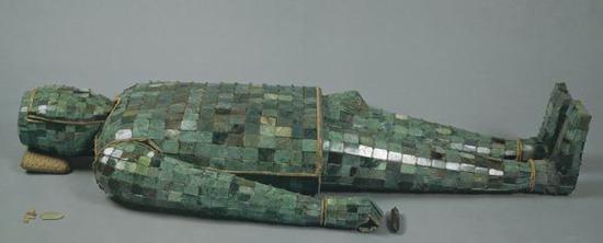 展出的金缕玉衣出土于河南永城芒砀山僖山1号汉墓,后确认是西汉晚期某位梁王的金缕玉衣。古人尚玉,以玉殓葬的传统由来已久,到汉代最为鼎盛。这件玉衣分头部、上衣、裤筒、手和脚五大部分,由2008块青玉组成。提起这件金缕玉衣,也许有人会问它跟河北满城汉墓的金缕玉衣有何关系。对此谭淑琴解释道:“第一代定都永城的梁王是汉文帝之子,汉景帝刘启的弟弟。满城汉墓金缕玉衣的主人中山靖王刘胜,则是汉景帝刘启之子。也就是说这两件金缕玉衣的主人沾亲带故。”“参观者可以把本次展览的文物与河北博物院的馆藏文物对照着看,一定收获更多。”