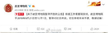 摘要: [故宫博物院通知9月21日至10月1日暂停对外开放 ]故宫博物院近期暂停开放9月11日,@北京故宫博物院 官方微博发布对外公告,根据工作需要和安排...