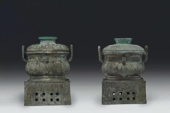 青铜直棱纹方座簋一对