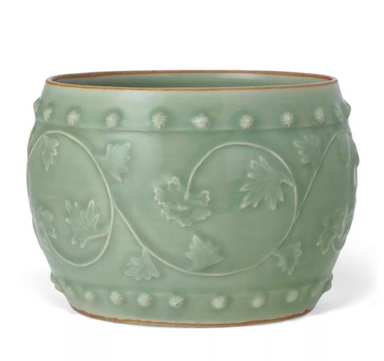 龙泉青釉浮雕牡丹纹大鼓钉罐