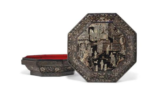 黑漆螺钿嵌庭院人物图八方盖盒