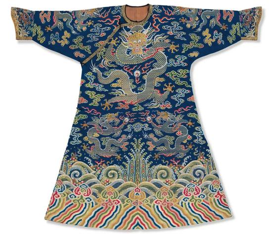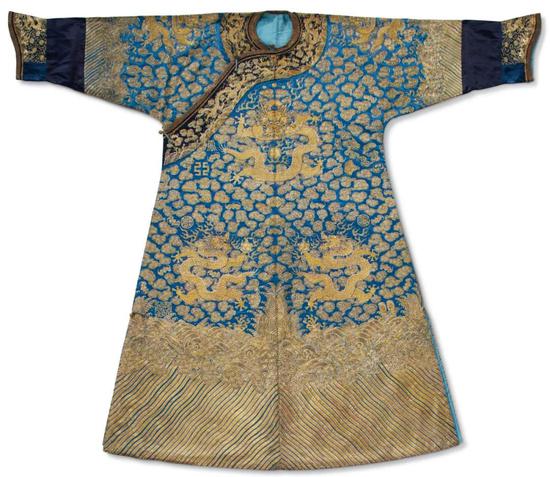 蓝缎地绣彩云金龙龙袍