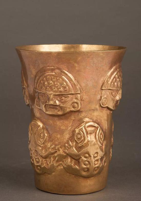 蟾蜍和西坎神纹黄金烧杯 西坎文化(750-1375年) 高14.8厘米,长9.9厘米,宽10.4 厘米 秘鲁中央银行附属博物馆藏