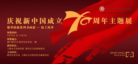 丹青歌盛世,翰墨颂中华。值此新中国成立七十周年之际,在上海市文史研究馆和静安区文化和旅游局的指导下,在“静安区文化发展专项资金”资助下,由敬华艺术空间、上海市文史研究馆书画研究社联合主办的“庆祝新中国成立70周年主题展:敬华海派系列书画展——海上风华”,将于9月29日在铜仁路92号敬华艺术空间开幕。