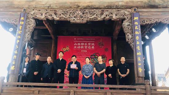 2019年9月26日,“山西静乐剪纸互动教育巡展”第四站在山西省忻州市秀荣书院开幕。文化和旅游部驻山西忻州(静乐)传统工艺工作站副站长、忻州市文化和旅游局党组书记、局长张正邦、文化和旅游部恭王府博物馆综合发展部许立栋、许琛、文化和旅游部机关党委纪委办公室主任,静乐县副县长孟宪章、静乐县文化和旅游局副局长弓玉祥、山西省剪纸协会会长郭梅花、山西省剪纸协会副会长李彬杰、山西灌木文化传媒有限公司公共事务经理武剑和山西灌木文化传媒有限公司项目顾问赵志强出席了开幕式。