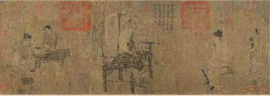 其中,唐人周昉的《仕女图》,因每位仕女发髻上都插有花朵,又名《簪花仕女图》。此画去年曾展出,本卷无款识、题跋、观款,画心有南宋“绍兴”连珠印、南宋贾似道“悦生”葫芦印,除此之外,无北宋以前,亦无元、明人的收藏印,后经清梁清标、安岐收藏,乾隆年间入藏清内府。