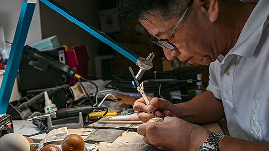 2019年8月22日,上海。蛋雕艺人李亚非在工作台上用刻刀在鸡蛋壳表面雕刻图案。 本文图片均为澎湃新闻记者 孙鹏程 图