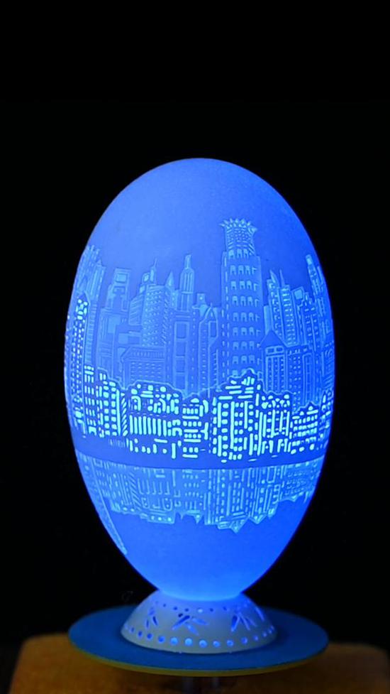 仅有0.4毫米的鹅蛋壳分成了5层,上海外滩万国建筑群以镂空呈现,后面新建的特别是改革开放以后盖起来的高楼建筑,则运用了浮雕,一层一层,整个浦西景色便逐渐映入眼帘。这是蛋雕艺人李亚非的新作品——映像外滩。