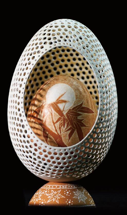 “鸡蛋壳厚度在0.3毫米左右,鹅蛋在0.4毫米左右,鸭蛋和鹅蛋差不多厚度。鸵鸟蛋比较厚,差不多在1毫米至1.5毫米左右。还有鸸鹋蛋,它非常漂亮,一共有三层。菜市场能买到的蛋都可以雕刻,比如鹌鹑蛋,甲鱼蛋,包括麻雀蛋我也尝试过。”李亚非说。