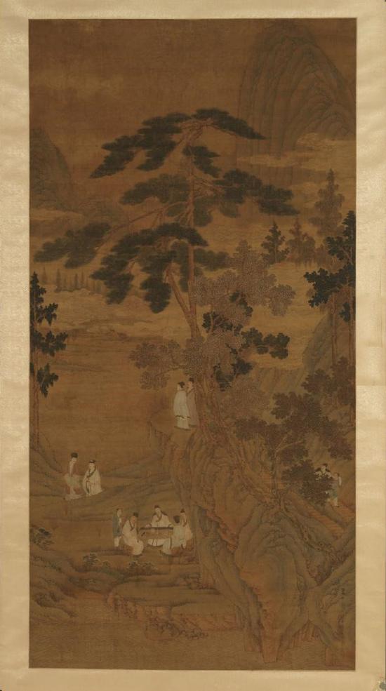 明代周臣《香山九老图》描绘白居易等9位文人墨客在洛阳香山聚会宴游、欣赏寺庙山林风光的历史故事