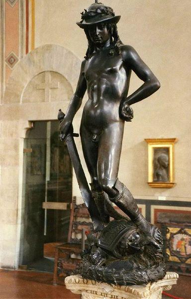 多纳泰罗(Donatello,1397~1475)的《大卫》是文艺复兴时期第一座裸体雕像,代表着古希腊罗马的人体美术传统得到恢复