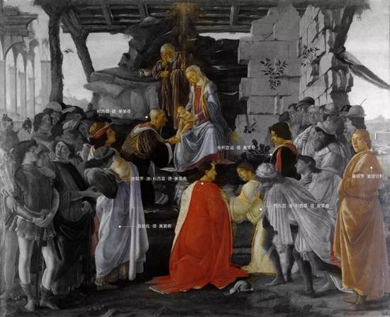 《博士来拜》之所以能成为波提切利艺术生命中重要的作品之一,并非是其构图或其他形式上的创新,而是因画中的人物形象皆以当时佛罗伦萨的统治者——美第奇家族为原型。