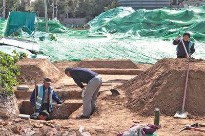 10月20日,新京报记者在东城区望坛棚户区改造项目工地上看到,部分工地区域已被围上绿色铁丝网,周围被装上了多个摄像头。多名着“北京考古”制服的工作人员手持铁铲等工具在内进行相关工作。透过铁丝网可以看到,多处考古坑内被清理出骨架,发掘点被标记号码。附近许多土堆被绿网遮盖。周边居民告诉新京报记者,曾看到现场人员从墓穴中清理出少量铜钱和罐状物品。现场安保人员称,他们24小时在此值班,防止有人进入考古区域。