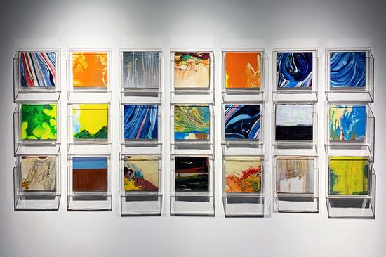“时间的厚度系列”是艺术家工作过程的一个思考,一般意义上的作品都是一个结果,大家往往忽略了作品诞生的一个过程,每个艺术家都有自己的创作方式和语言,有些艺术家依靠草图,有的依靠文字阐释等等,何俊艺有一种自己的工作方式,平常有很多画坏的作品和实验的作品,虽然从以往绘画标准来说是失败的,但对他来说是特别重要的,没有这些过程就没有结果。于是把那些作品等比例裁切,最后叠成像一本书一样的方式,并用标本式的装裱来呈现。通过这种解构,观众只能看到一个局部去想象原来的一个画面。“时间的厚度”对何俊艺而言是一个关于过程与结果,失败和成功的一个思考。