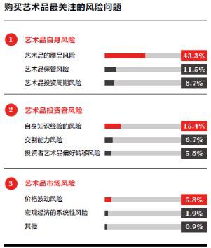 “艺术品自身的赝品风险”是投资者在购买艺术品时最关注的风险问题,占了43.3%;其次是对于“自身知识经验不足所带来的风险顾虑”,占15.4%;再次是“艺术品的保管风险”,占11.5%。