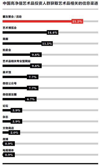 藏友聚会成为最受青睐的艺术品信息渠道,占比21%;其次是艺术博览会和画廊,分别占14.4%和11.5%