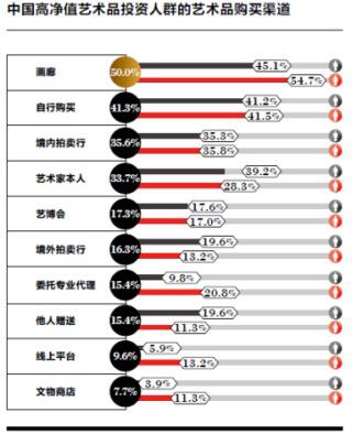 五成通过画廊购买艺术品,其次是自行购买和境内拍卖行,分别占41%和36%。男士选择向艺术家本人购买的比例高出女性四成