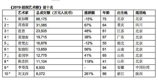 2019年3月,胡润研究院发布《2019胡润艺术榜》,榜单内容为前100位中国在世“国宝”艺术家按照2018年度公开拍卖市场作品总成交额的排名。今年是胡润研究院连续第十二年发布“胡润艺术榜”、第七年发布《胡润最畅销中国艺术家百强榜》,榜单数据来源是AMMA雅昌艺术市场监测中心。75岁的崔如琢连续五年成为中国最成功的在世艺术家,过去一年成交额8.8亿。周春芽成交额增长67%,晋升第二;范曾成交额增长48%,重返前三甲。榜单总成交额连续两年上涨,今年上涨20%。北京是在世国宝艺术家之都,前100名中占了一半多。更多内容请浏览《2019胡润艺术榜》。