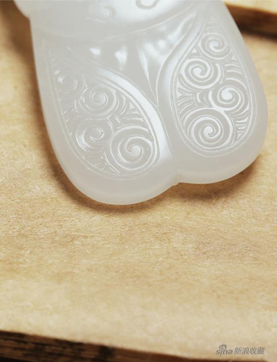 这件“蝉形佩”则以阴刻工艺为之,内敛而低调,有种不张扬的美。阴刻对于工艺要求较高,一刀下去,如果出现失误,则是无法修改,哪怕失误一点点整个画面也要重新磨平全部重来,这对创作者是个极大的挑战。