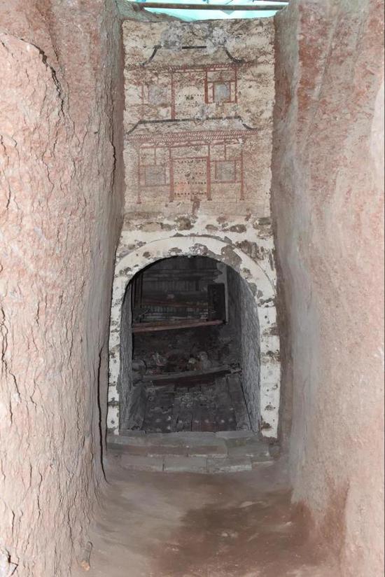 墓葬为单室砖室墓,由封土、墓道及壁龛、封门、照墙、甬道和墓室等组成。封土呈丘状。墓道位于墓室南部,通长17.5米,深0~3.5米,长斜坡底。墓道内随葬有木构件、墨绘砖块、调色石、木旌旗杆及殉牲(马、羊)等,近墓门处东西两侧各设一壁龛,壁龛内均随葬有彩绘陶、木质仪仗俑群,总计70余件组。封门墙由砖砌墙和墓门组成,其中砖砌墙共四道,封门砖墙里侧、券门口内安设有双扇木门,门扉上安鎏金铜锁,扉面上均对称镶嵌有排列整齐、大小相同的鎏金铜泡钉5排10列共计50个。因木门柱底部部分腐朽,门整体由南向北坍塌,打开封门墙后可见其整体坍塌平铺于甬道内。