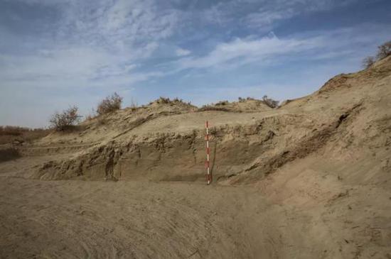 在沙丘西部清理表层沙土后,发现房屋三间。房屋修筑方式是利用“减地法”向下掏挖,在原始生土堆积中,掏挖修筑出三间半地穴式房屋,室内面积约80平方米。