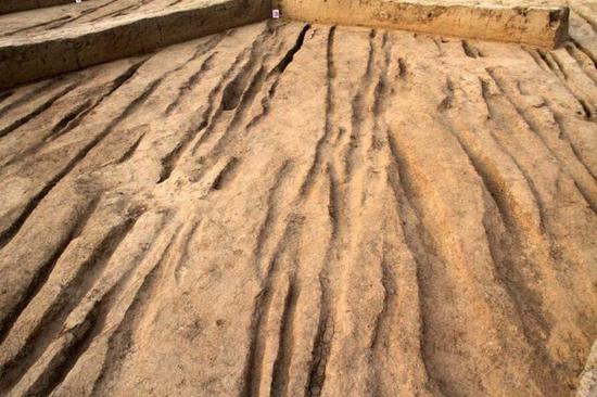 据陕西省考古研究院助理研究员陈爱东介绍,这次发掘在位于西安市东北郊区的三义庄和谢二村进行,其中三义庄古道遗迹主体呈东北-西南走向,现清理南北长约105米、宽约30米道路。路面车辙分布密集紧凑,辙痕行进方向与古道走向保持一致,基本处于路面中部,少量车辙连续蜿蜒不断,大多数车辙或断续或逐渐消失或交错叠合。另外,车辙附近还发现有疑似脚印及动物蹄印等。