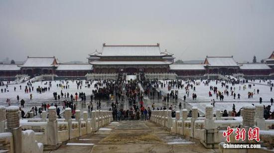 2019年11月30日,北京一场初雪后,城市银装素裹,故宫博物院迎来今年第一批赏雪游客。乔丹 摄