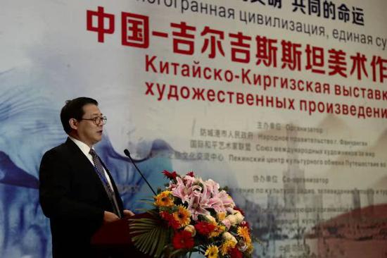 李延强在开展仪式上致辞,对所有嘉宾、艺术家的到来致以诚挚的欢迎。他表示,今年是中国和吉尔吉斯斯坦建交27年,中吉两国携手走过了不平凡的岁月。此次在防城港市举办中国—吉尔吉斯斯坦美术作品展,就是希望中吉两国朋友们更多地了解彼此、喜欢彼此,成为中吉友好的坚定力量。同时,此次展览也是“多彩的文明,共同的命运”系列美术作品展于去年6月在比什凯克成功举办世界文明古国和平艺术家画展之后的又一盛举;是防城港市落实中吉两国领导人关于深化人文交流倡议的务实之举;更是防城港市作为中吉两国重要合作支点,建立更多元、更频繁文化艺术交流的新开始。李延强希望防城港市与吉尔吉斯斯坦友好共进,友谊渊源流长,并祝愿此次中吉美术作品展圆满成功。
