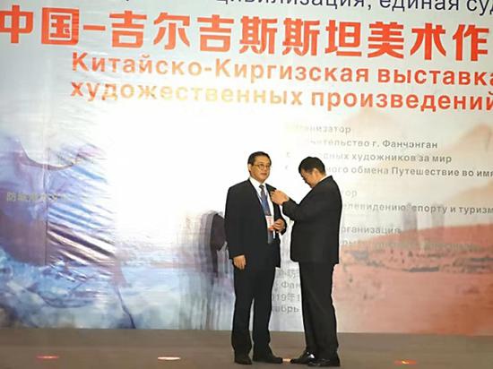 开展仪式上,吉尔吉斯斯坦文化、旅游和信息部副部长伊玛纳利耶夫卡依拉特为中国美术家协会党组书记、常务副主席徐里颁发吉尔吉斯斯坦文化部“杰出文化人物”勋章。
