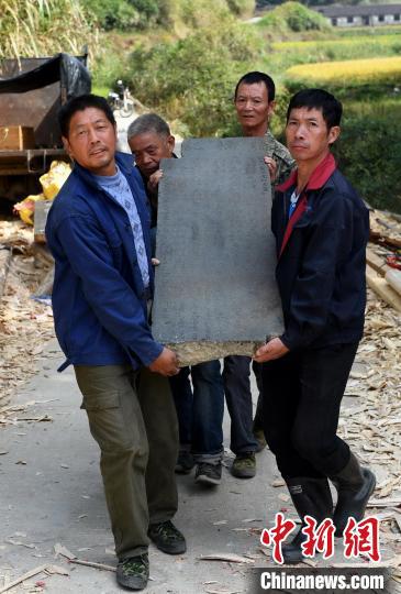 邵武市和平镇坪上村村民展示该村发现的一块清康熙年间“御茶园”石碑。(乐细巾 摄) 乐细巾 摄