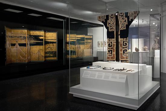对表面和颜色的关注唤起了日本美学的精致与平衡。 日本北方土著阿伊努人的艺术作品,包括有图案的长袍、沉重的珠子项链和小铲子。这是一个精致的,经过深思熟虑的展示,为展陈设计形成了对比和补充。自1912年收入重要的阿伊努人的手工艺品之后,博物馆方面就不遗余力在收集由在世大师创造的日本民间艺术品和陶瓷藏品。