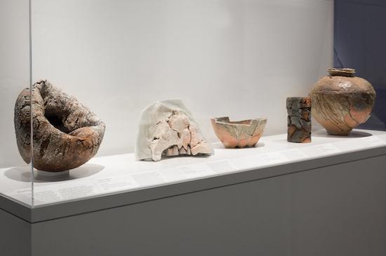 在展厅中,一个简单的绳纹时期(4,000年至5,000年前)的容器标志着日本运用粘土的悠久历史。但该部分的重点,如果不是新的展陈,那就是当代陶瓷及玻璃制品上。2013年,藤冈树平(Fujioka Shuhei)制作的杏仁形花瓶,用带有灰釉的橙色瓷器令人惊叹; 还有Katsumata Chieko自2011年以来留下的令人难以忘怀的巨型瓷器。