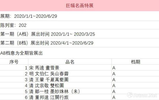 目前,台北故宫博物院公布了“巨幅名画”第一期展品:宋马远的《画雪景》、明文伯仁的《吴山春霁》、清王翬的《千岩万壑图》、清沈宗敬的《双松图》、清邹一桂的《墨妙珠林(未)》、清董邦达的《江关行旅》。
