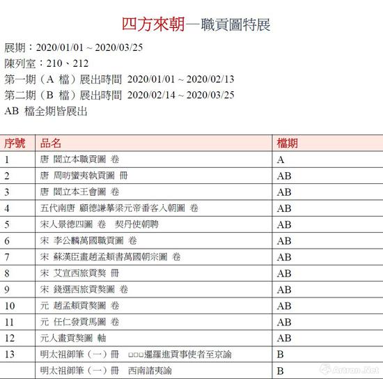 “四方来朝——职贡图特展”展示了历朝历代的 《职贡图》,兼具纪实和想像的阎立本《职贡图》,刻画古代中国为世界中心的《契丹使朝聘》,暗喻华夷有别的李公麟《万国职贡图》,揭示地缘政治的阎立本《王会图》、顾德谦《摹梁元帝番客入朝图》,体现治外方略的《明太祖御笔》、谢遂《职贡图》,描绘人物牵曳走兽的经典图式,如周昉《蛮夷执贡图》、明人画《麒麟沈度颂》等,勾勒出古代中国万朝来臣的盛况。这一展览亦有两档展期:第一期2020年1月1日至2月13日,第二期为2月14日至3月25日,在北部院区第一展览区210、212展出。